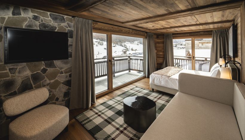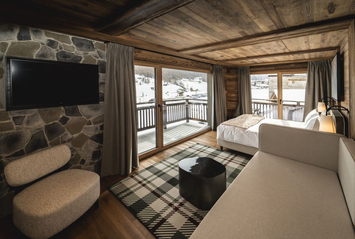 The room is completed by a comfortable double bed, flat-screen TV and balcony with a view. A perfect retreat for those seeking intimacy, alpine charm and wellness details.
